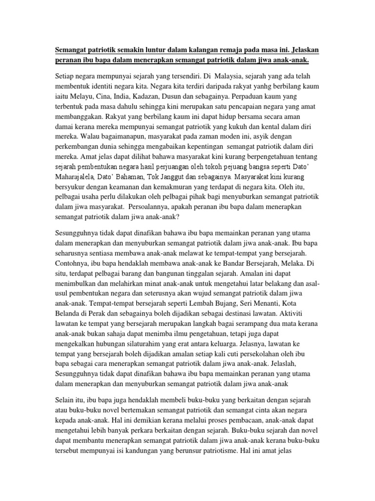 Generasi muda terutamanya pelajar tidak lagi bersemangat. Berikut dikongsikan dua contoh karangan spm berkaitan pentingnya sambutan bulan kemerdekaan dan hari malaysia kepada rakyat malaysia yang. Jelaskan peranan ibu bapa dalam menerapkan semangat patriotik dalam jiwa anak-anak.